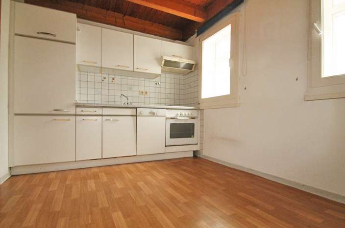 Auf der rechten Seite befindet sich die funktionale Einbauküche, ausgestattet mit Herd, Kühlschrank, Dunstabzugshaube sowie einer kompakten Spülmaschine. Darüber hinaus bietet der Raum ausreichend Platz für einen Essbereich.