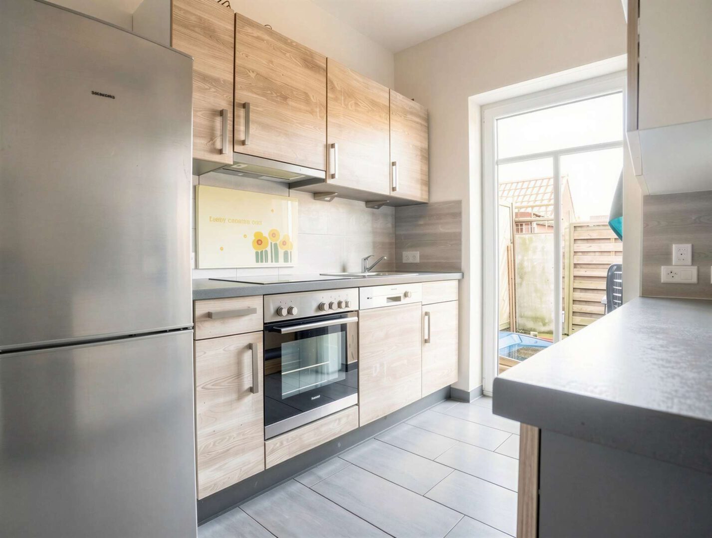 Die Küche ist mit einer voll ausgestatteten Einbauküche versehen und bietet zusätzlich Platz für eine kleine Sitzgelegenheit – ideal für den morgendlichen Kaffee oder ein gemeinsames Frühstück. Von hier aus führt auch die Treppe in das Dachgeschoss. Der Raum unter der Treppe wurde sinnvoll genutzt und bietet einen praktischen Abstellraum, der sich hervorragend für Vorräte oder Reinigungsutensilien eignet.