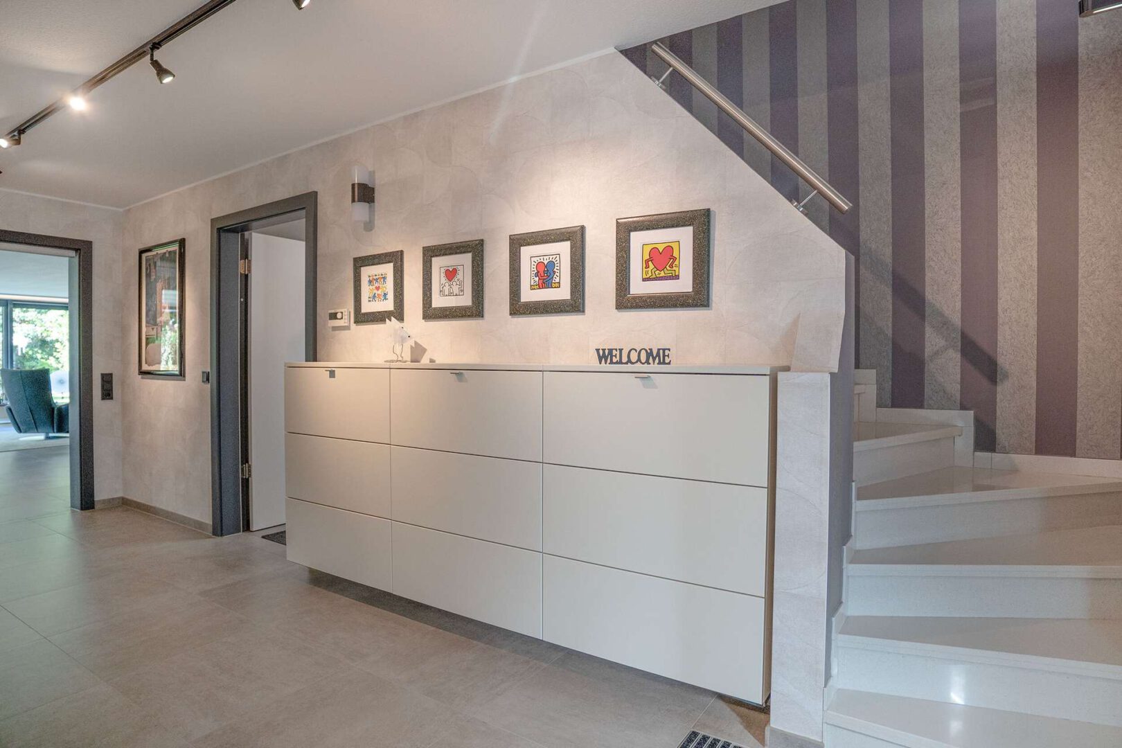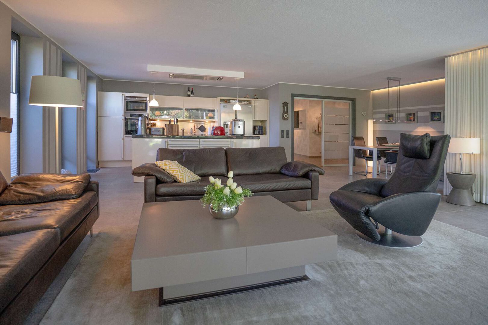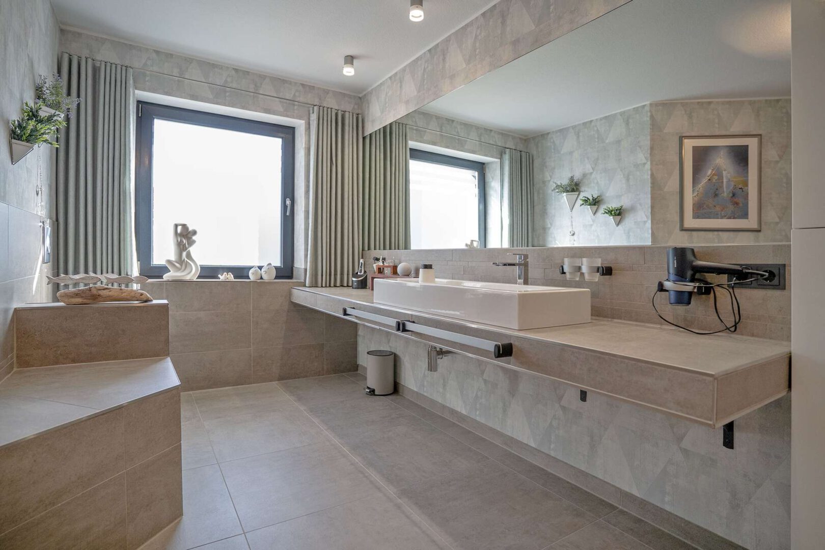 Breite Türen von 210 x 96 cm ermöglichen barrierefreies Wohnen, während eine Glas-Schiebetür den Wohnbereich stilvoll abgrenzt. Modernste Technik sorgt für Komfort: alle Fenster sind dreifach verglast und teilweise mit elektrischen Metallrollläden ausgestattet. Die Hebe-Schiebe-Anlagen im Wohnbereich werden automatisch durch elektrisch gesteuerte Raffstores mit Sonnensensor beschattet.