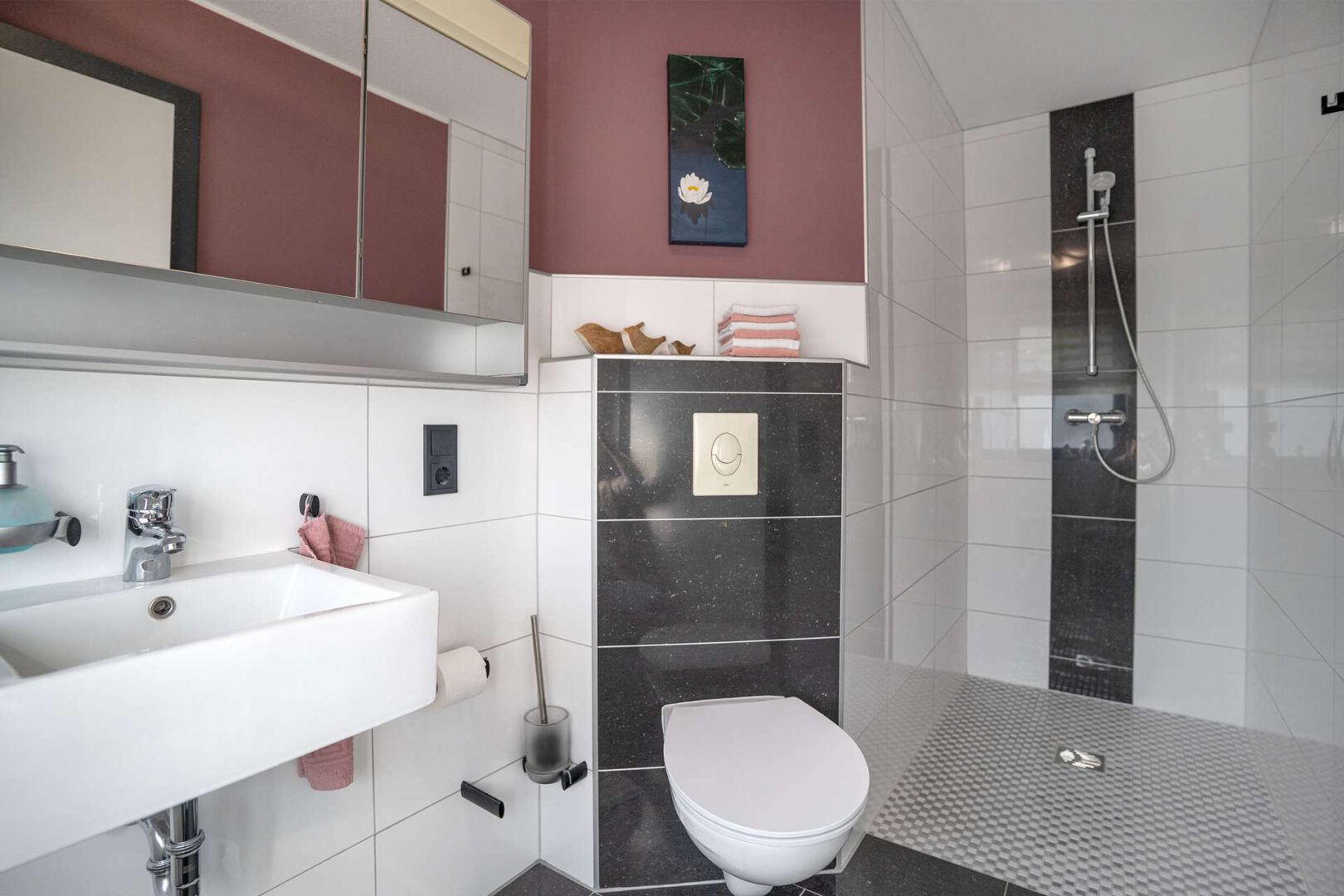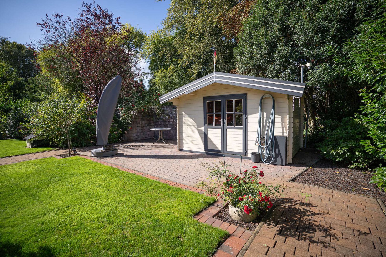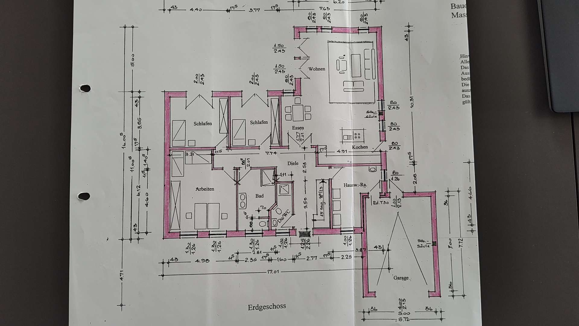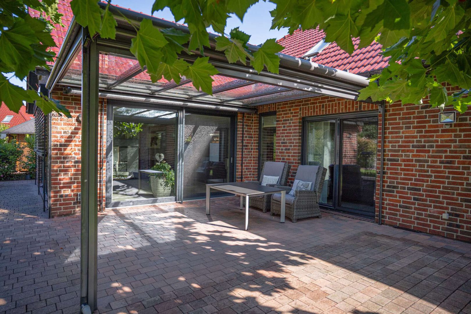 Die Terrasse mit Glasüberdachung, seitlichen Sonnenschutzrollos und Markise lädt zu entspannten Stunden im Freien ein. Natürlich darf auch ein Gartenhaus nicht fehlen. Vom Hauswirtschaftsraum gelangt man direkt in die 35 m² große Garage, die mit praktischen Wandschränken und einer Wallbox ausgestattet ist. Eine Treppe neben dem Eingangsbereich führt in das ausgebaute Dachgeschoss, das sich auch als eigenständige Wohneinheit oder für Gäste nutzen lässt. Hier erwarten Sie ein lichtdurchflutetes Wohnzimmer mit sieben Velux-Dachfenstern und neuem Laminatboden, ein etwa 22 m² großes Schlafzimmer, ein Abstellraum sowie ein Badezimmer mit Wanne, Dusche und einem separaten Bereich für Brennwerttherme und Warmwasserspeicher.