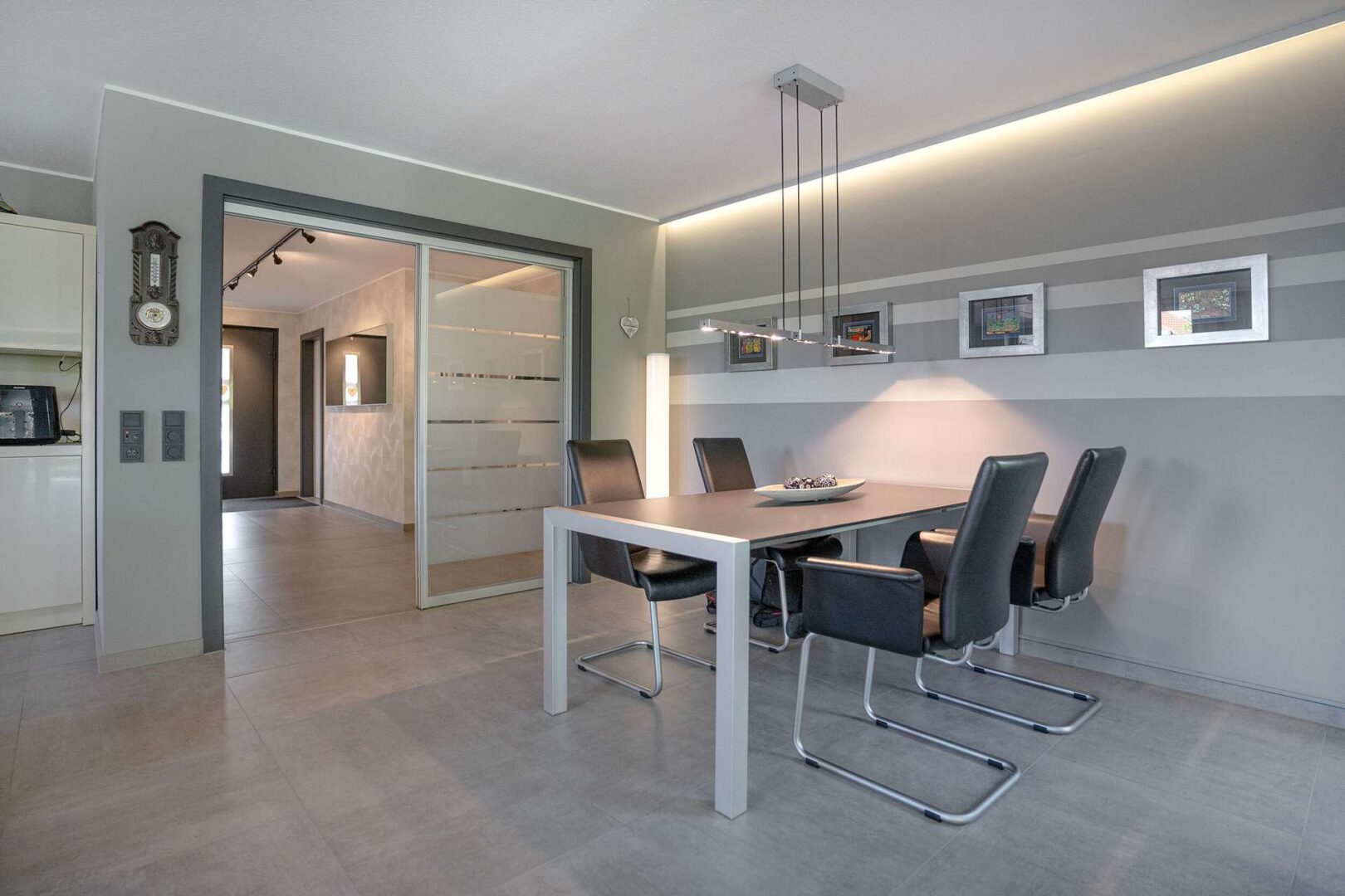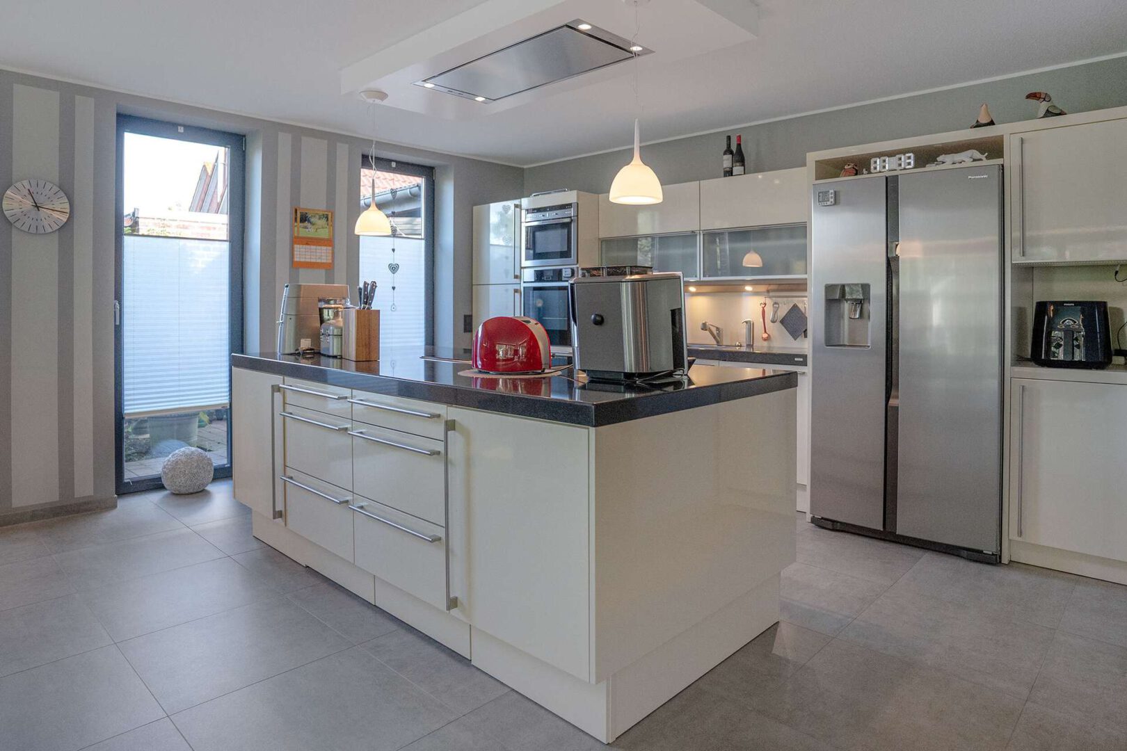 Mit 279 m² Wohnfläche auf zwei Etagen und einem 1.201 m² großen Grundstück bietet es reichlich Platz für die ganze Familie und lässt sich mühelos als komfortables Mehrgenerationenhaus nutzen. Das Erdgeschoss erstreckt sich über etwa 184 m², ist vollständig gefliest und wird durch eine energieeffiziente Fußbodenheizung angenehm temperiert. Das Herzstück des Hauses ist der offene Wohn- und Essbereich mit etwa 68 m², der dank bodentiefer und deckenhoher Fenster in ein Meer aus Tageslicht getaucht wird. Die elegante "Siematic"-Küche mit Kochinsel, hochwertigen Elektrogeräten der Marke "Neff" und Side-by-Side-Kühlschrank und lädt zu kulinarischen Abenteuern ein. Drei weitere Zimmer, ein großzügiges Badezimmer mit Dusche, ein Gäste-WC mit Dusche sowie ein praktischer Hauswirtschaftsraum ergänzen das Erdgeschoss.