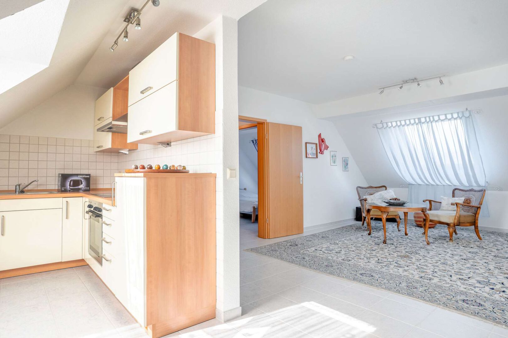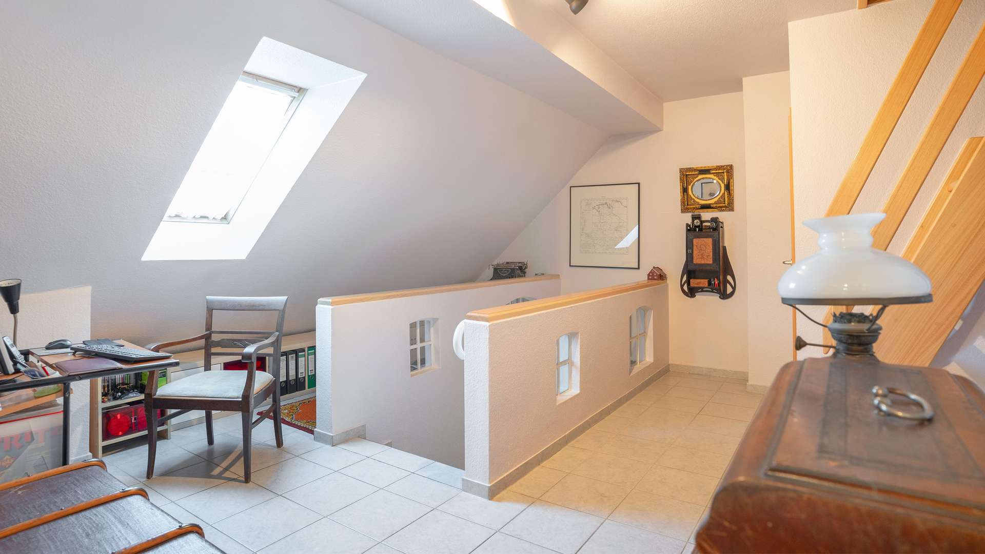 Im Obergeschoss präsentiert sich ein Gästebereich, der durch seine großzügige angenehme Raumwirkung überzeugt. Helle Räume, ein Tageslichtbad mit Dusche, Küche, Wohnbereich und ein Schlafzimmer schaffen ein stimmiges Gesamtbild.