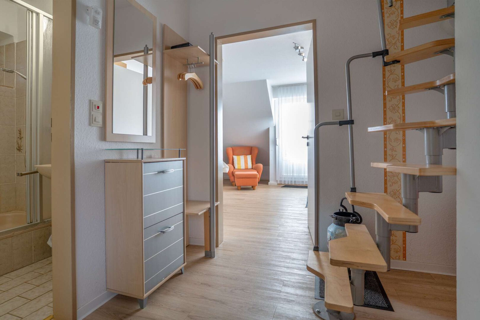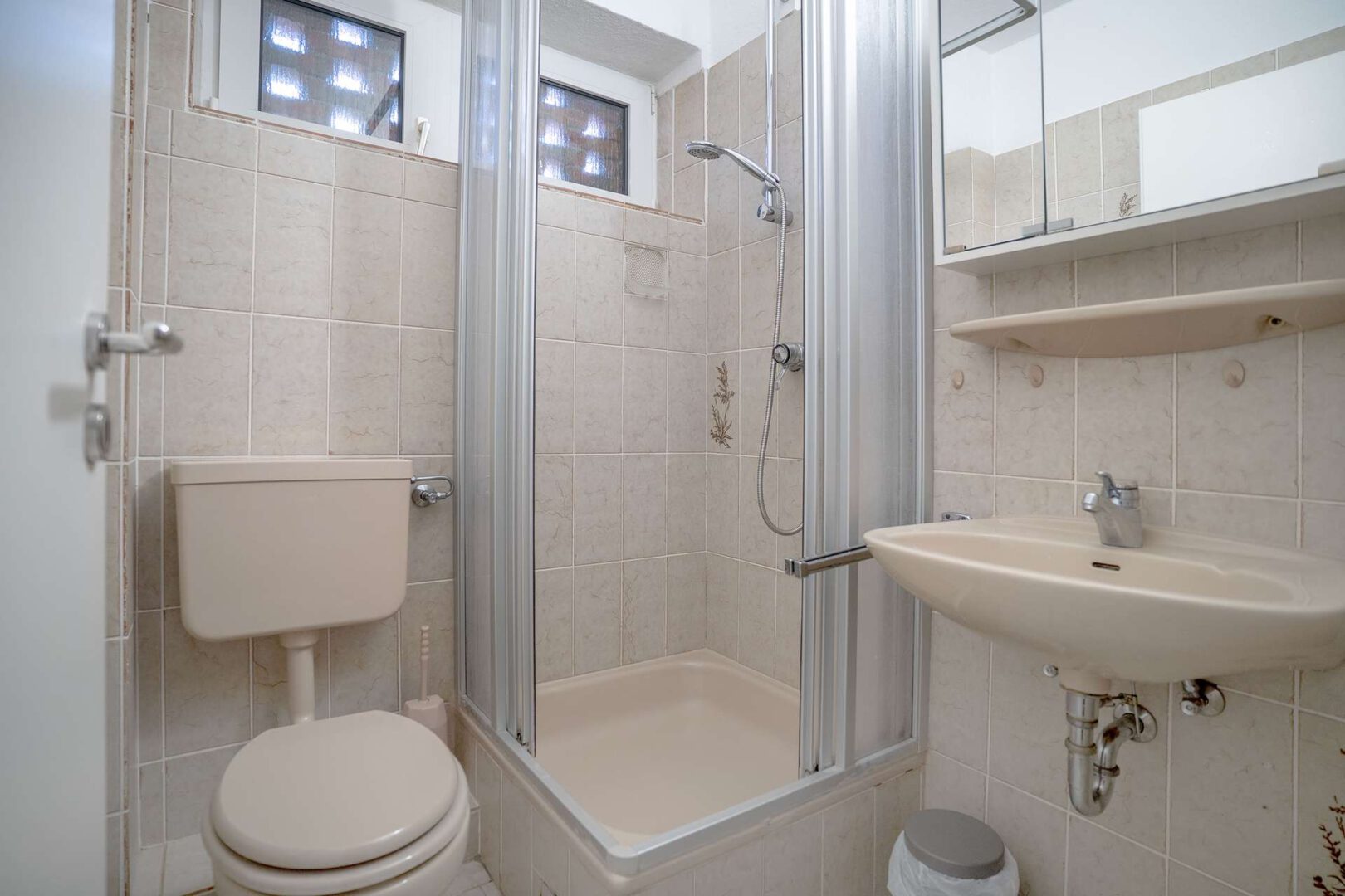 Der Eingangsbereich begrüßt die Bewohner mit einem kleinen, aber funktionalen Flur und Raumspartreppe, der einen reibungslosen Zugang zur gesamten Wohnung ermöglicht. Das Badezimmer ist mit einer Dusche, einem WC und einem Handwaschbecken ausgestattet und entspricht dem Standard des Baujahres.