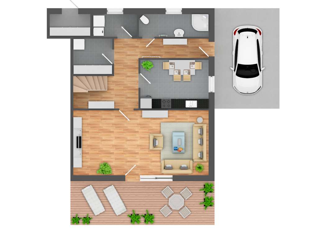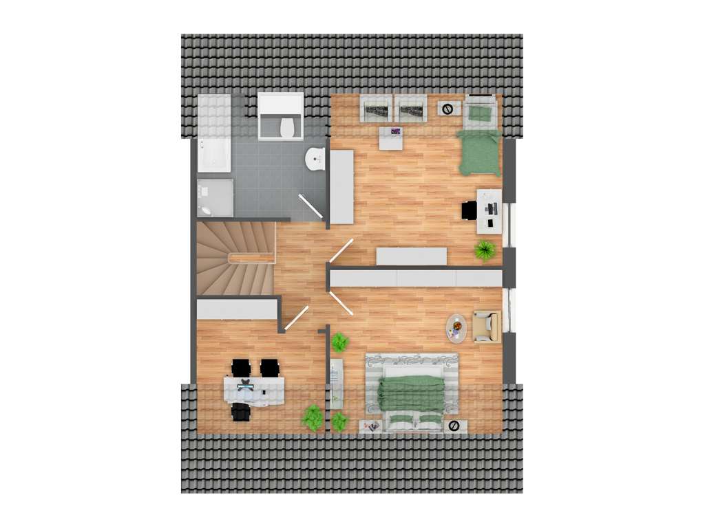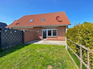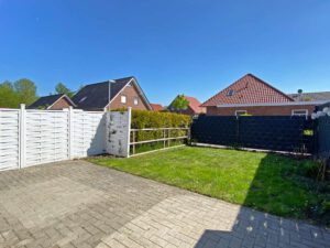 Den Mittelpunkt des Erdgeschosses bildet das Wohnzimmer. In diesem ist ein heller Laminatboden verlegt, welcher in Kombination mit den großen Fensterelementen für eine helle und freundliche Wohnatmosphäre sorgt. Zudem gelangen Sie über diesen Raum auf die Terrasse, auf der Sie die Sonne Ostfrieslands in vollen Zügen genießen können. Eine Markise spendet bei Bedarf ein wenig Schatten. Das Dachgeschoss der Haushälfte hält drei weitere Zimmer sowie ein zweites Tageslichtbad bereit.