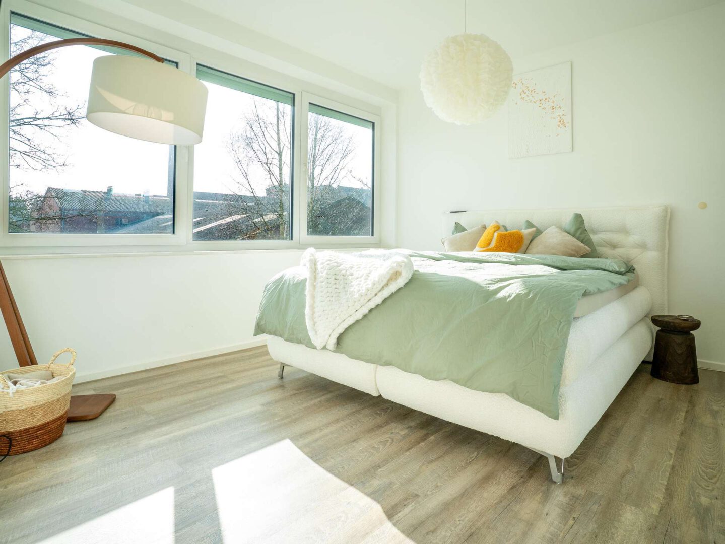 Angrenzend befindet sich das geräumige Tageslichtschlafzimmer. Dank des guten Zuschnitts bietet es ausreichend Stellfläche für ein Doppelbett sowie einen großen Kleiderschrank und schafft so eine angenehme Rückzugsoase mit viel Stauraum.