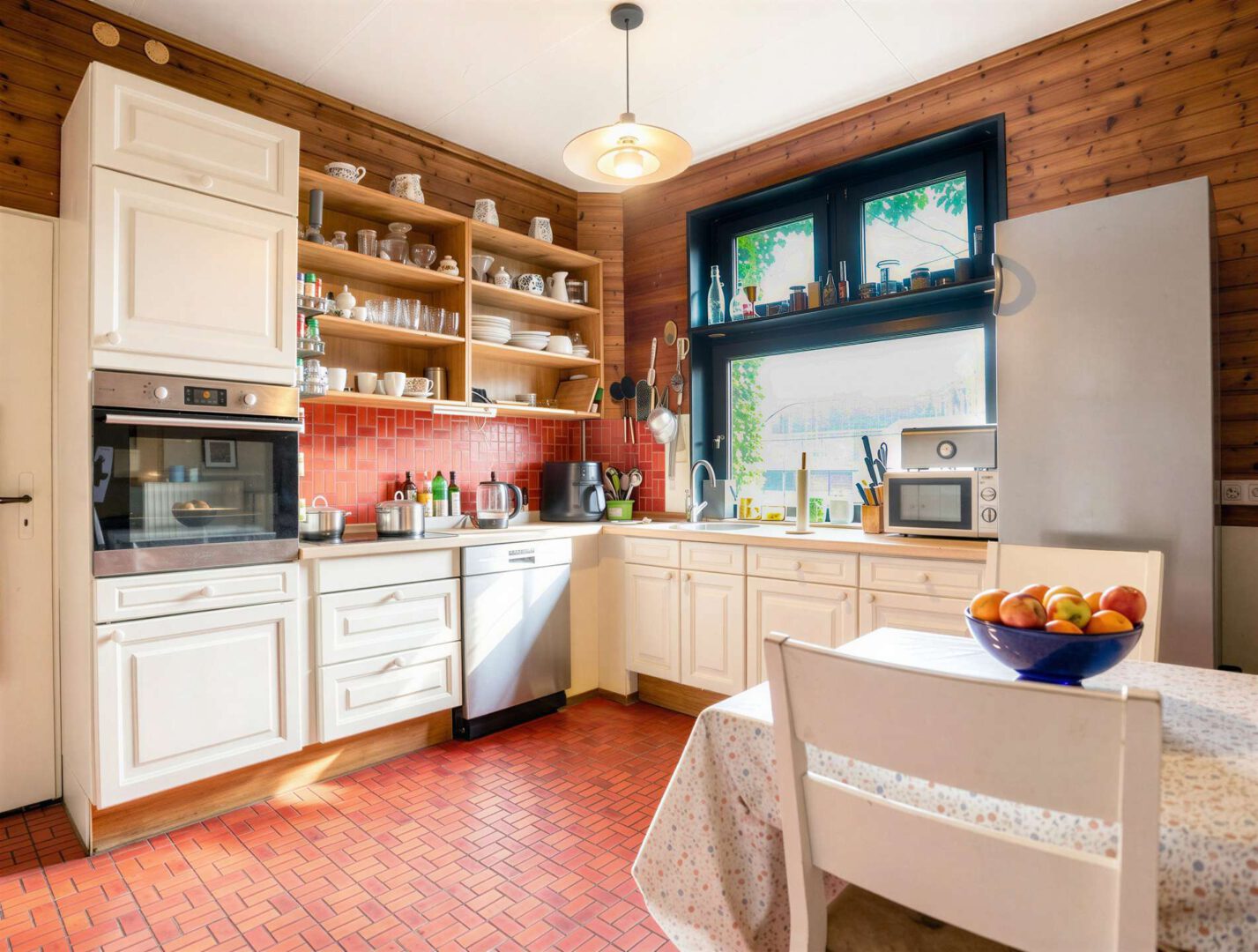 Im Erdgeschoss befindet sich zur rechten Seite eine geräumige Küche mit Einbauschränken, die außergewöhnlich viel Stauraum bietet und damit ideale Voraussetzungen für ambitionierte Hobbyköche schafft. Direkt angrenzend liegt ein praktischer Hauswirtschaftsraum, der zusätzlichen Platz für Vorräte und Haushaltsutensilien bereithält. Vom zentral gelegenen Flur aus gelangen Sie außerdem in ein Schlafzimmer sowie in ein saniertes Tageslichtbad mit ebenerdiger begehbarer Dusche. Herzstück dieser Ebene ist der großzügige Wohn- und Essbereich, der viel Raum für gemeinsame Stunden bietet. Im Essbereich sorgt ein charmanter Erker für eine besonders behagliche Atmosphäre – mit Blick ins Grüne.