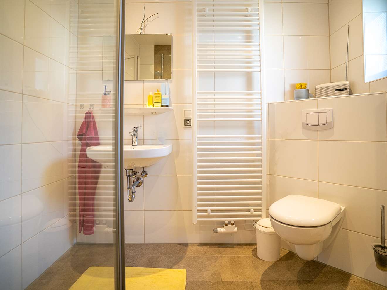 Die Einbauküche überzeugt mit ansprechendem Design und funktionaler Ausstattung. Direkt angrenzend befindet sich das vollständig sanierte Badezimmer, das mit einer ebenerdigen Dusche, modernen Fliesen, einem Handwaschbecken, WC sowie einem praktischen Toplader ausgestattet ist, der den Mietern zur Nutzung zur Verfügung steht.