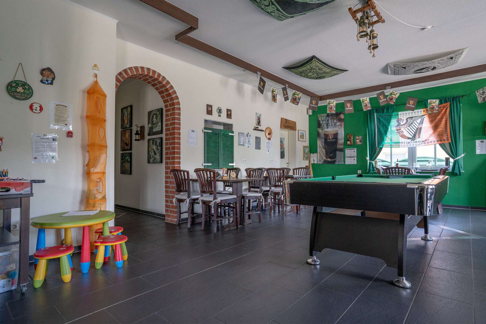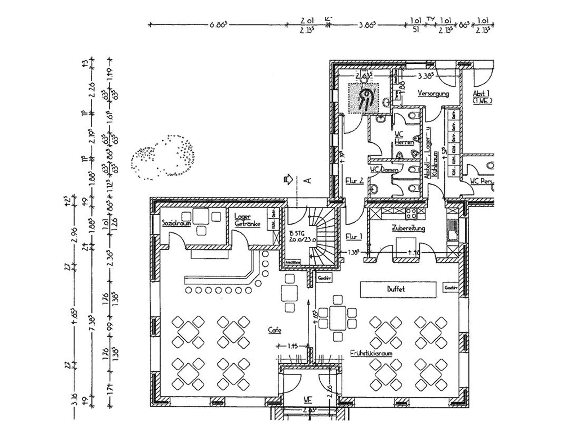 Die Sanitäranlagen sind in tadellosem Zustand und umfassen selbstverständlich ein rollstuhlgerechtes WC mit Wickelkommode sowie eine separate Personaltoilette. Der Küchenbereich ist aktuell mit einer modernen Einbauküche ausgestattet, kann aber auf Wunsch mit einer professionellen Gastroküche nachgerüstet werden – individuell abstimmbar mit dem Vermieter.