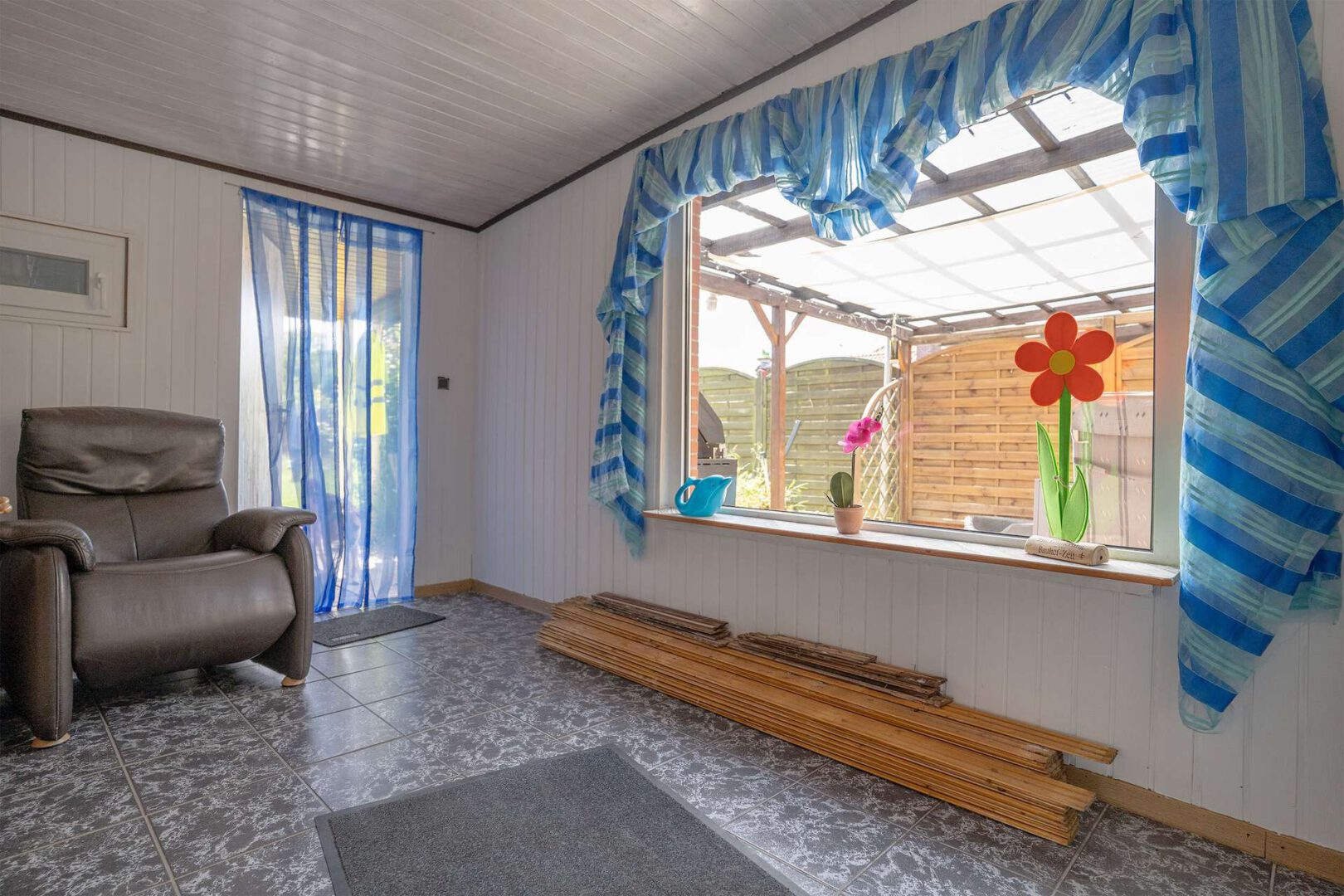 Im Erdgeschoss befinden sich ein helles, großzügiges Wohnzimmer, Eine separate Küche mit Essbereich und einer modernen Einbauküche aus dem Jahr 2020 sowie ein ebenerdiges Schlafzimmer. Ein helles Tageslichtbad mit Dusche sorgt für Komfort im Alltag. Über einen überdachten Durchgang (mit Anschluss für die Waschmaschine) gelangen Sie ins angrenzende Nebengebäude mit zwei Räumen, welche derzeit als Werkstatt genutzt werden. Ein Durchgangszimmer gewährt zudem den direkten Blick und Zugang zur überdachten und windgeschützten Terrasse, deren Überdachung erst 2024 erneuert wurde und zum Verweilen im Freien einlädt.