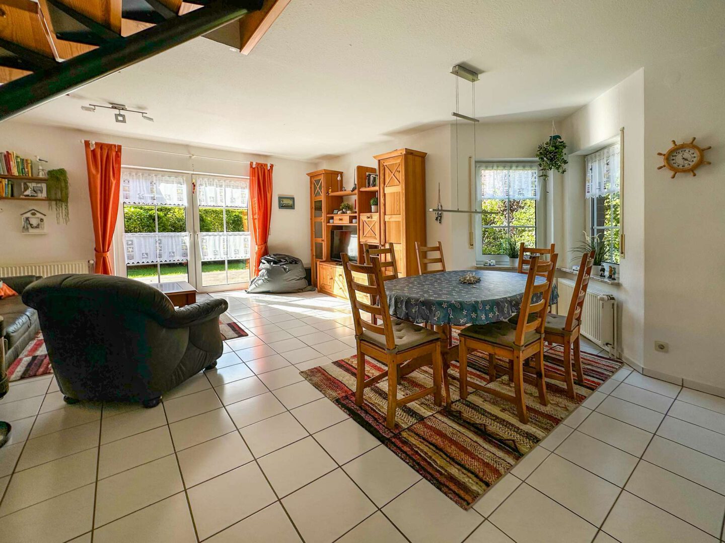 Im Erdgeschoss empfängt Sie ein freundlicher Eingangsbereich mit Gäste-WC und praktischer Vorratskammer. Das Herzstück des Hauses bildet der großzügige, lichtdurchflutete Wohn- und Essbereich mit offener Einbauküche. Große Fenster sorgen für eine angenehme Wohnatmosphäre und von hier aus gelangen Sie direkt auf die windgeschützte Terrasse – der perfekte Ort, um sonnige Stunden zu genießen oder den Tag entspannt ausklingen zu lassen. Eine erst vor zwei Jahren installierte Markise sorgt bei Bedarf für angenehmen Schatten.
