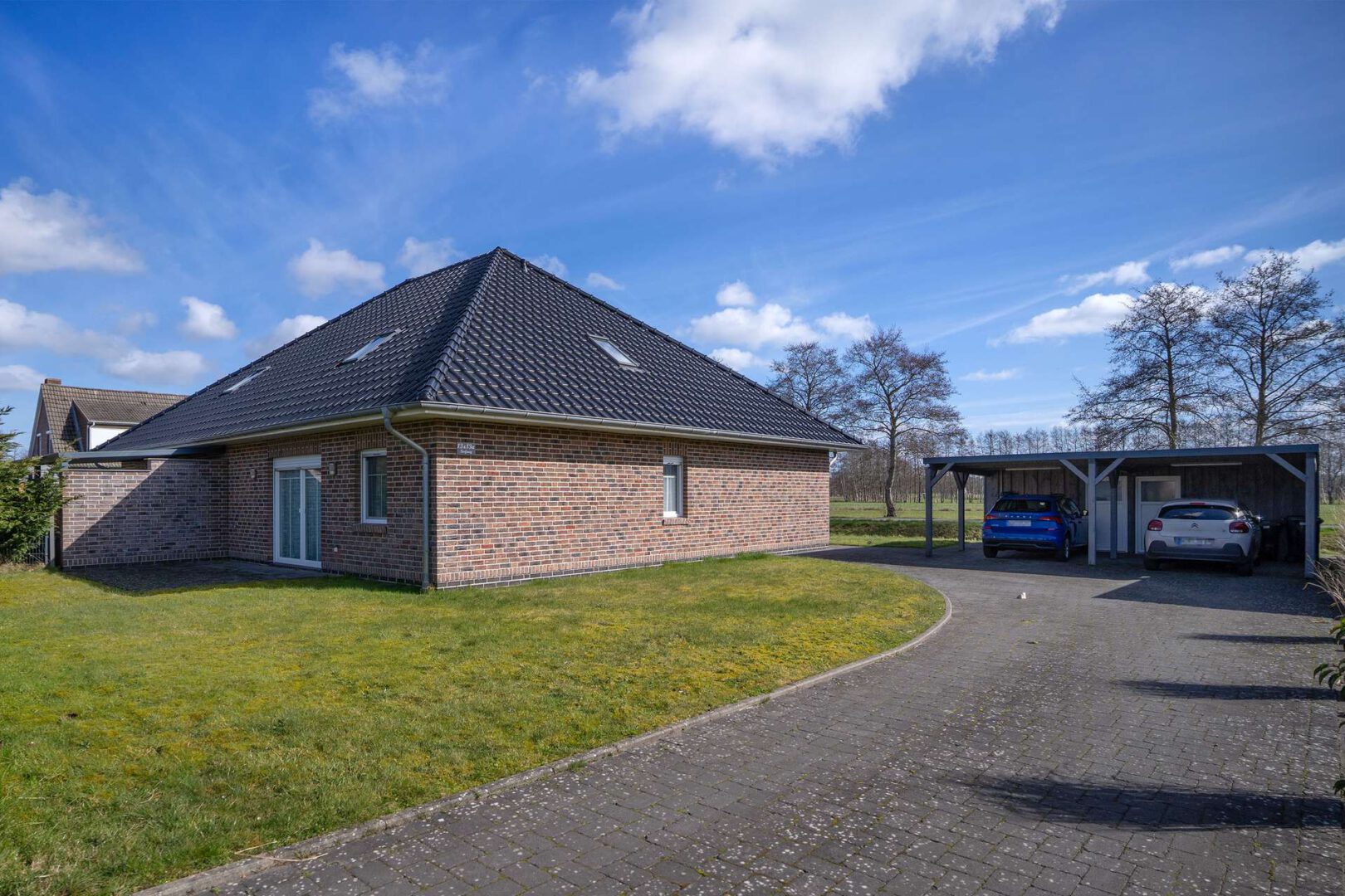 Zum Objekt gehört ein pflegeleichter Grundstücksanteil von etwa 490 m². Ein Carport-Stellplatz, ein separater Geräteraum sowie eine einladende Terrasse mit Überdachung runden das Angebot ab.
