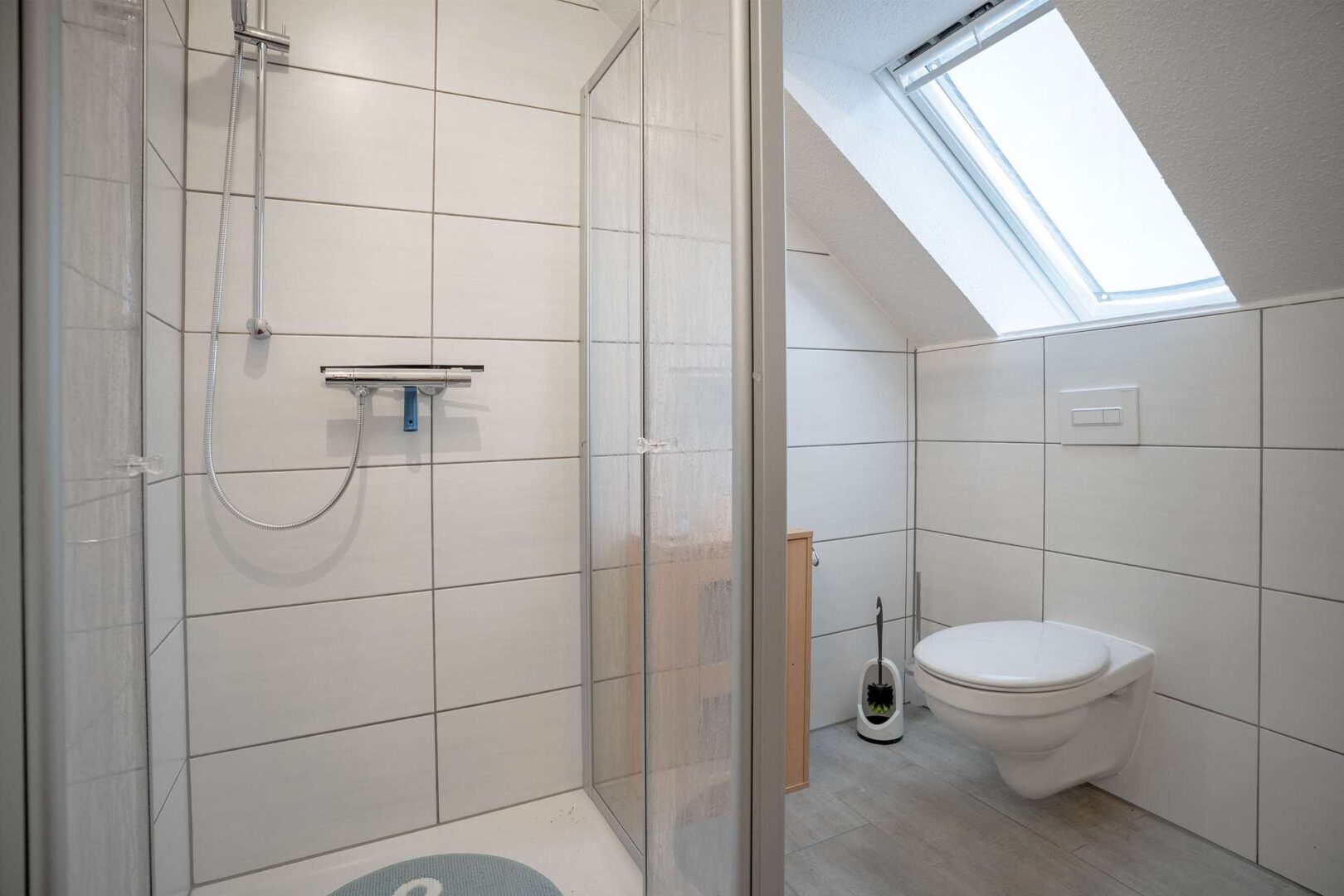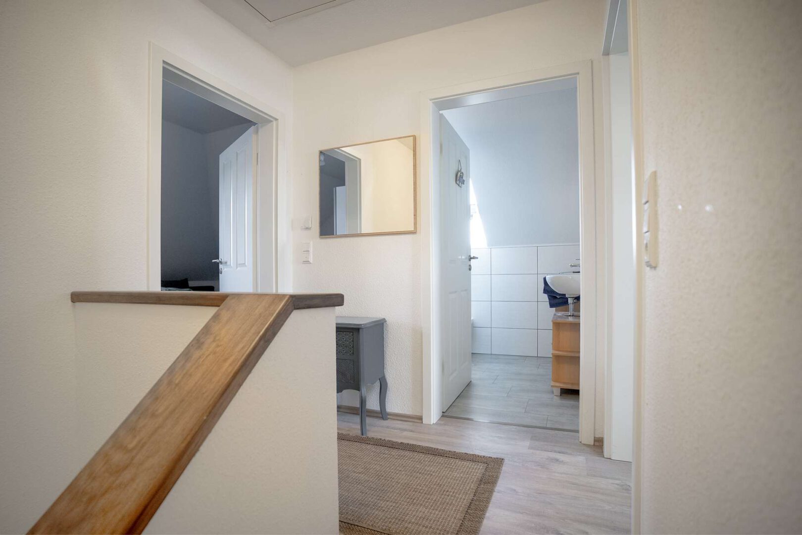 Für ein angenehmes Wohnklima sorgt eine Fußbodenheizung in allen Räumen. Die dreifach verglasten Kunststofffenster sind mit Außenrollläden ausgestattet. Hochwertige Fliesen in Holzoptik finden sich in den Bädern, im Wohn- und Küchenbereich, im Flur sowie im Hauswirtschafts- und Heizungsraum, während die Schlafzimmer und der Flur im Obergeschoss mit Laminat ausgelegt sind.