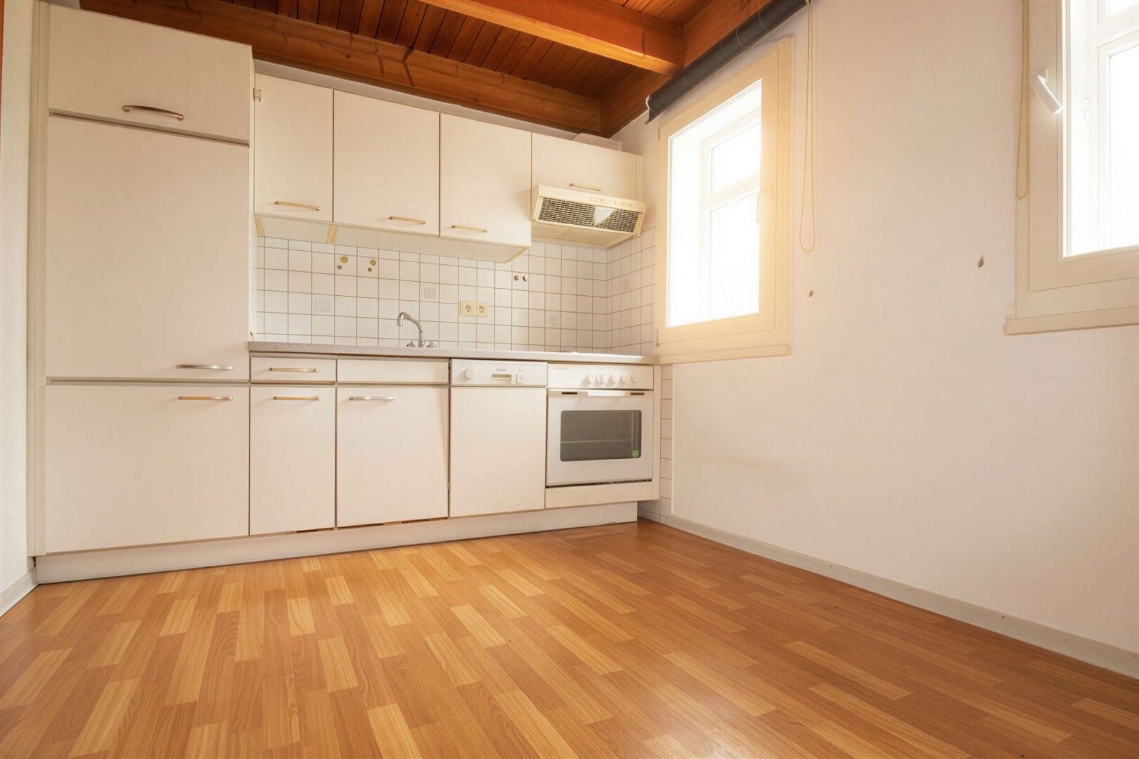 Auf der rechten Seite befindet sich die funktionale Einbauküche, ausgestattet mit Herd, Kühlschrank, Dunstabzugshaube sowie einer kompakten Spülmaschine. Darüber hinaus bietet der Raum ausreichend Platz für einen Essbereich.