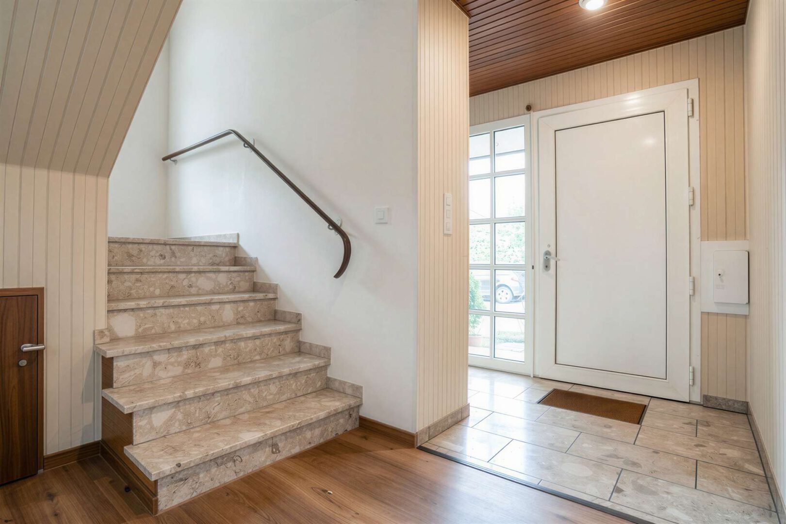 Im Obergeschoss befinden sich drei unterschiedlich geschnittene Schlafzimmer, eines davon mit direktem Zugang zur großen Loggia, die einen ruhigen Rückzugsort im Freien bietet. Ein Tageslichtbad mit Wanne und Dusche sowie ein geräumiger Flurbereich vervollständigen die durchdachte Aufteilung dieses Hauses.
