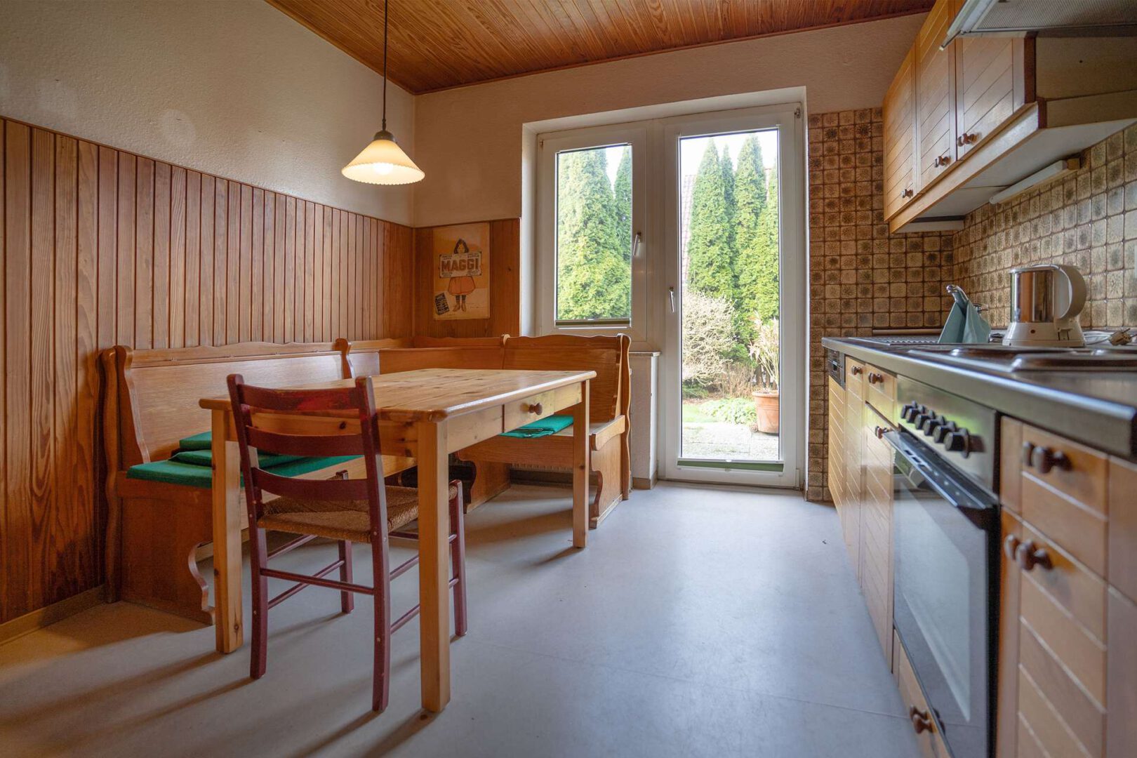 Ein Gäste-WC im Flurbereich sorgt für zusätzlichen Komfort im Alltag. Die Küche mit Zugang zum Garten verfügt über einen großen, direkt angrenzenden Abstellraum, der vielfältige Nutzungsmöglichkeiten bietet, sei es für Vorräte, Haushaltsgeräte oder als kleiner Hauswirtschaftsbereich. Das geräumige Wohnzimmer mit direktem Zugang zur Terrasse lädt zum Entspannen ein und öffnet den Blick in den liebevoll angelegten Garten, der ideal für Freizeit, Gärtnern oder gemütliche Stunden im Freien geeignet ist.