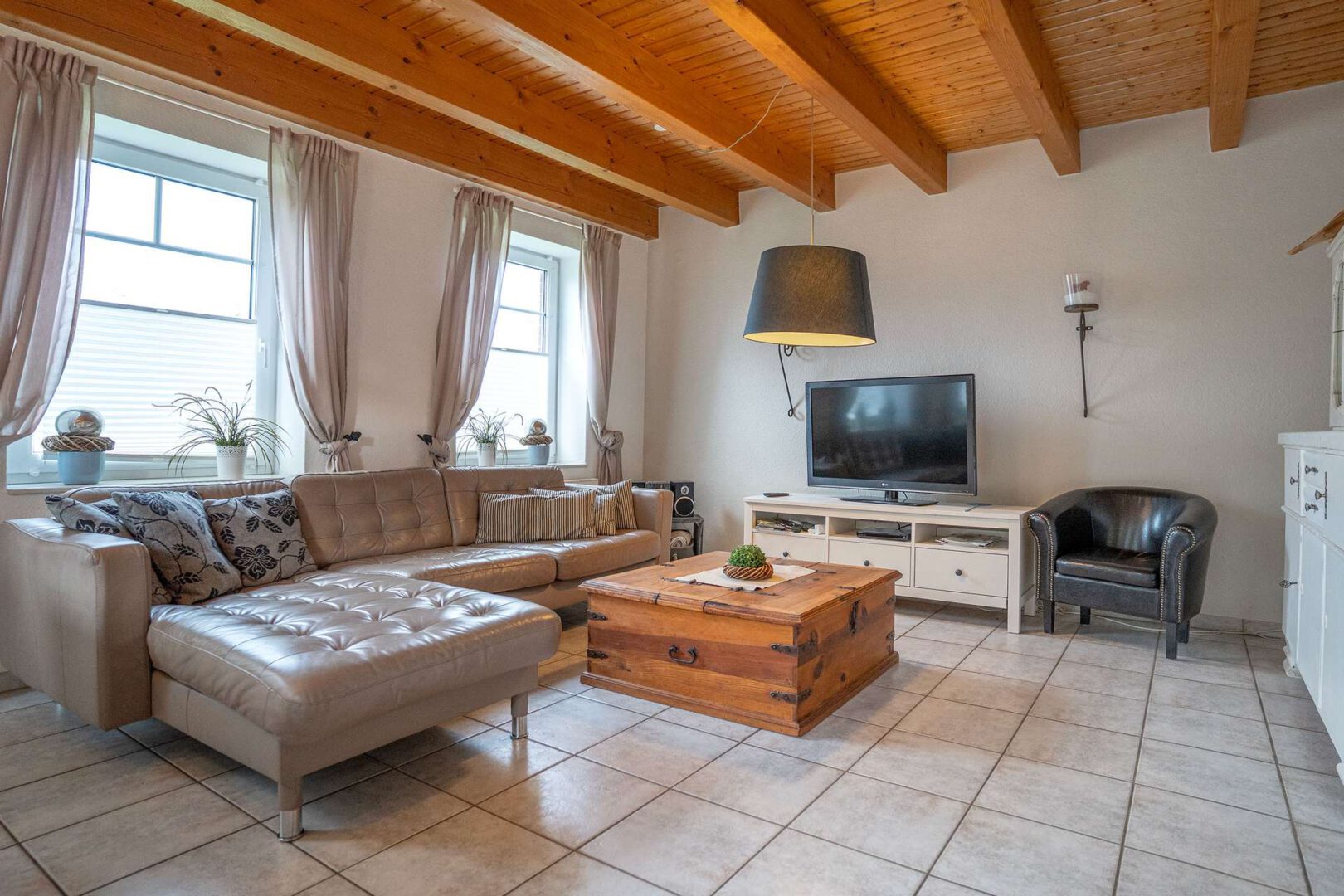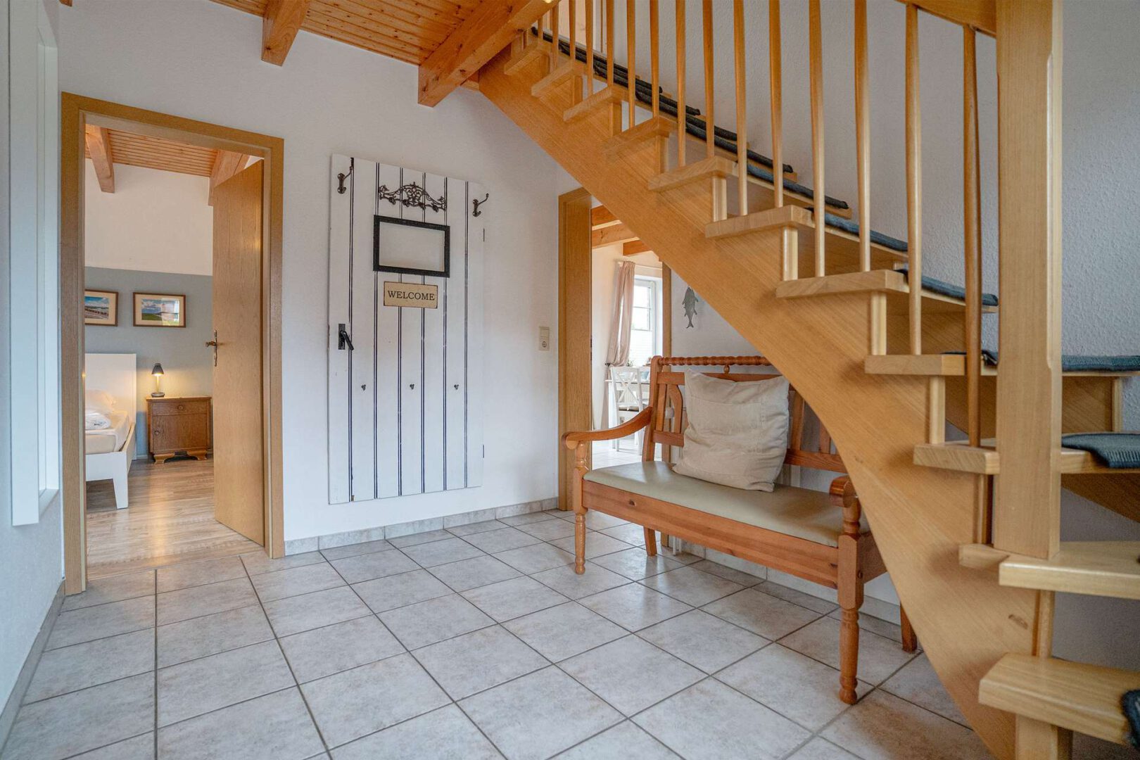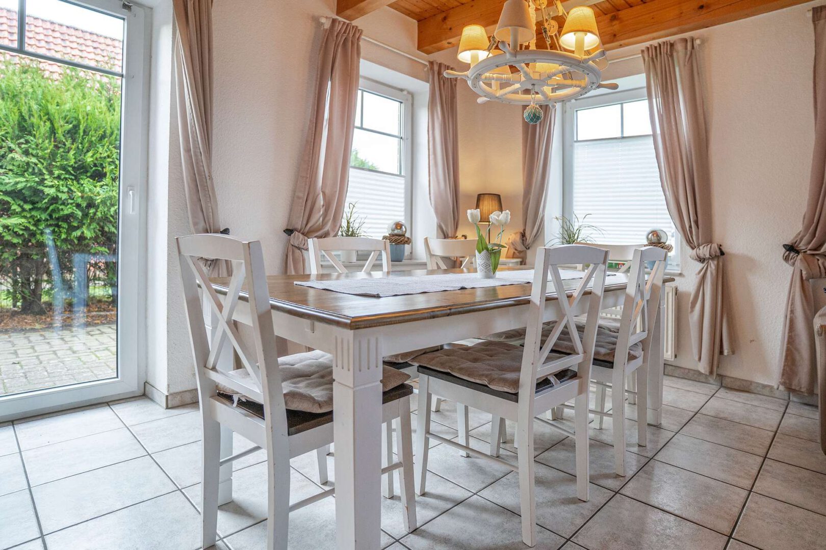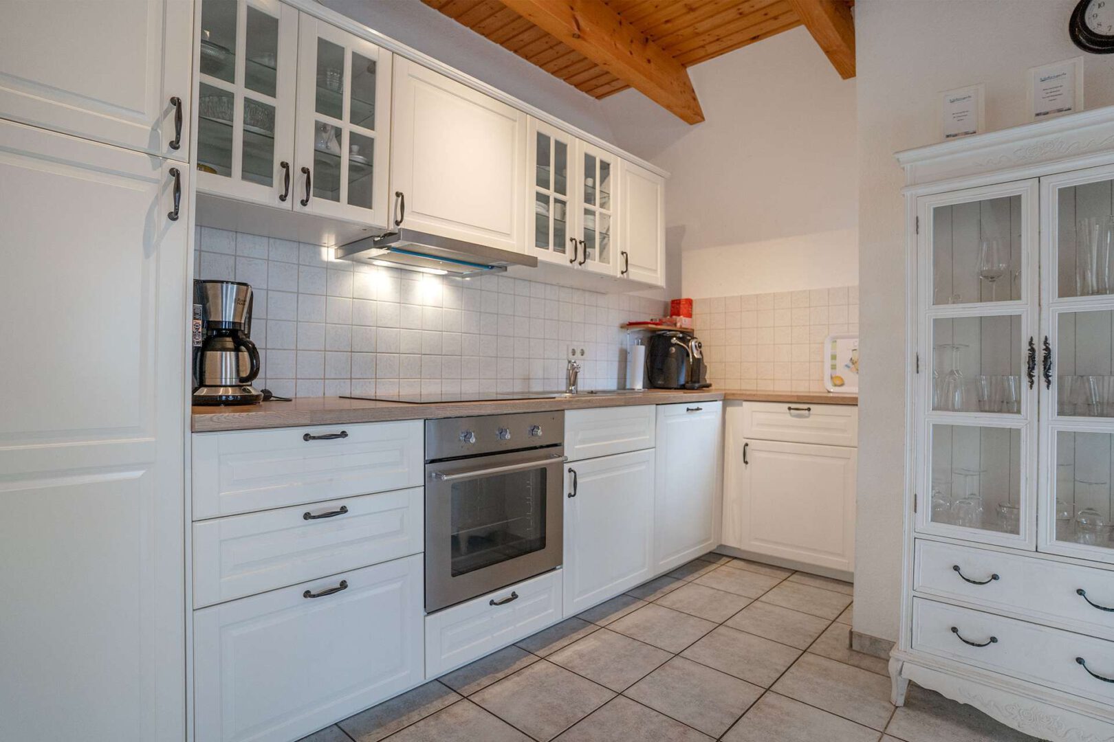 Im Inneren besticht das Haus durch ein modernes und gepflegtes Ambiente, das sofort Urlaubsgefühle aufkommen lässt. Der offene Wohn- und Kochbereich im Erdgeschoss bildet das kommunikative Herzstück: Die geschmackvolle Einbauküche aus 2018 verbindet zeitgemäße Ausstattung mit Landhausstil und fügt sich harmonisch in den lichtdurchfluteten Wohnbereich ein. Ein Abstellraum sowie ein separater Hauswirtschaftsraum bieten zusätzliche Ordnungsmöglichkeiten und erleichtern den Alltagskomfort – besonders praktisch für längere Aufenthalte.