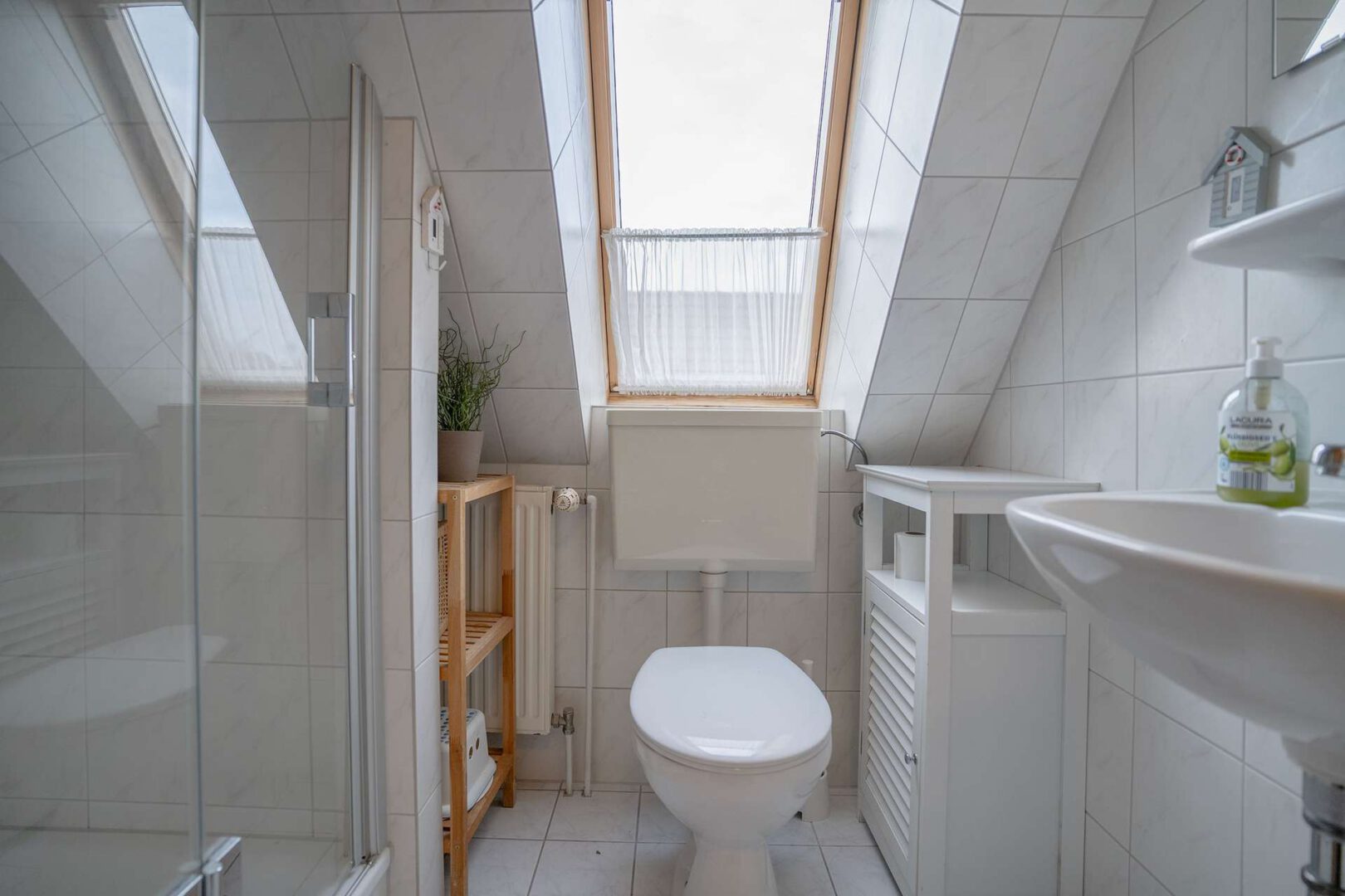 Zwei Tageslichtbäder, jeweils mit Dusche und WC ausgestattet, sorgen auf beiden Ebenen für maximalen Komfort. Das ebenerdige Schlafzimmer schenkt bequeme Zugänglichkeit, während im Obergeschoss zwei weitere Schlaf- bzw. Kinderzimmer für individuelle Rückzugsorte und erholsame Nächte sorgen. Die gesamte Ausstattung ist bereits im Kaufpreis enthalten und macht die sofortige Ferienvermietung besonders unkompliziert.