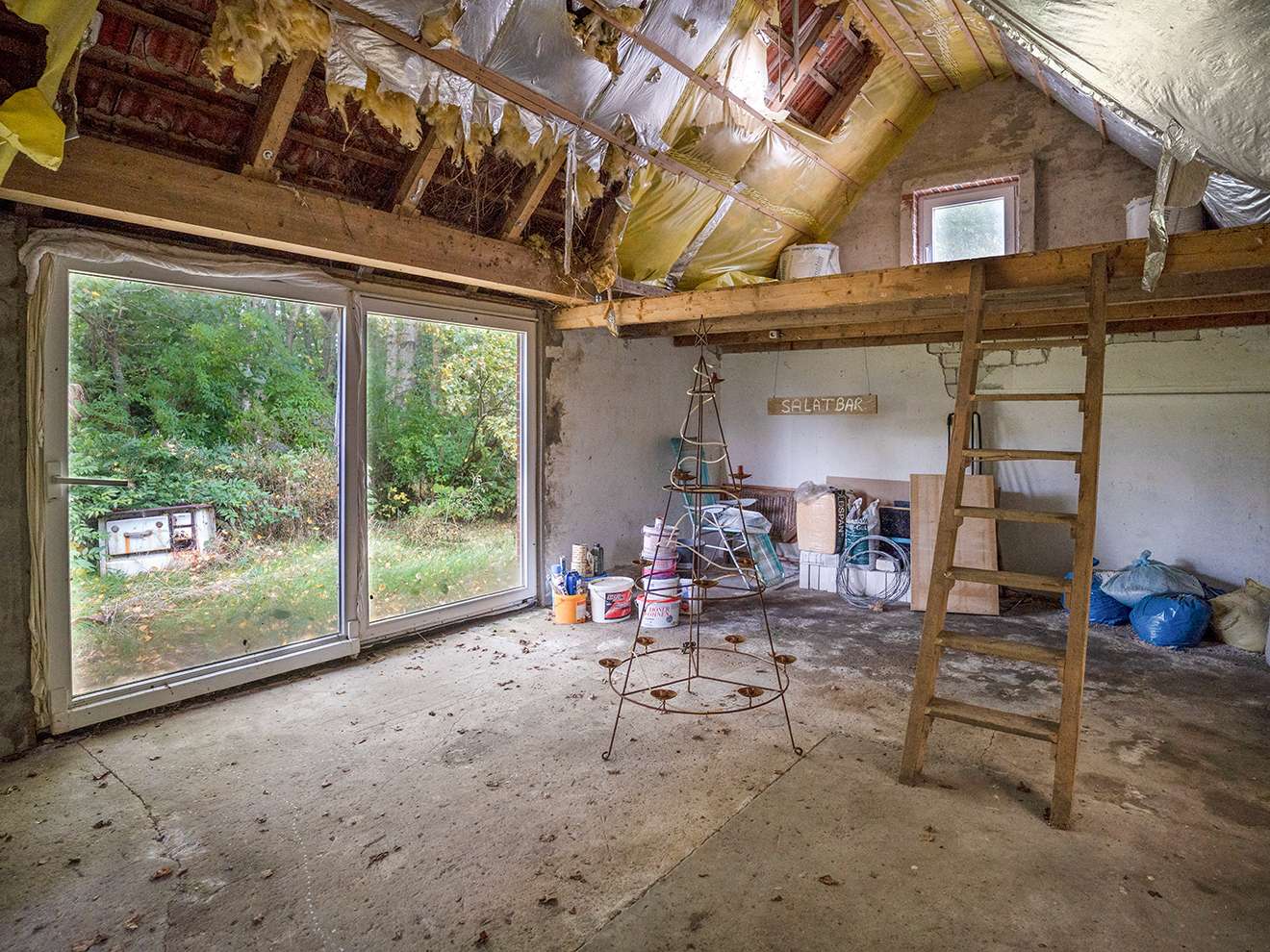 Der Hintereingang des Hauses führt in den weitläufigen Garten und zu einem Nebengebäude aus dem Jahr 1953. Dieses umfasst einen Hauswirtschaftsraum sowie einen separaten Abstellraum. Besonders hervorzuheben ist der große, ehemalige Scheunenteil, der vielfältige Nutzungsmöglichkeiten bietet – sei es als Werkstatt, Lagerfläche oder Hobbyraum. Auch ein Ausbau zu zusätzlichem Wohnraum wäre denkbar; hierfür müsste jedoch eine Bauvoranfrage gestellt werden.