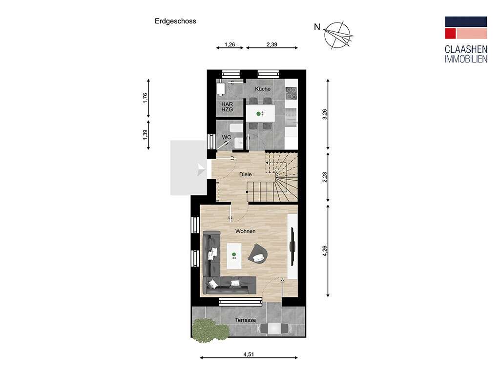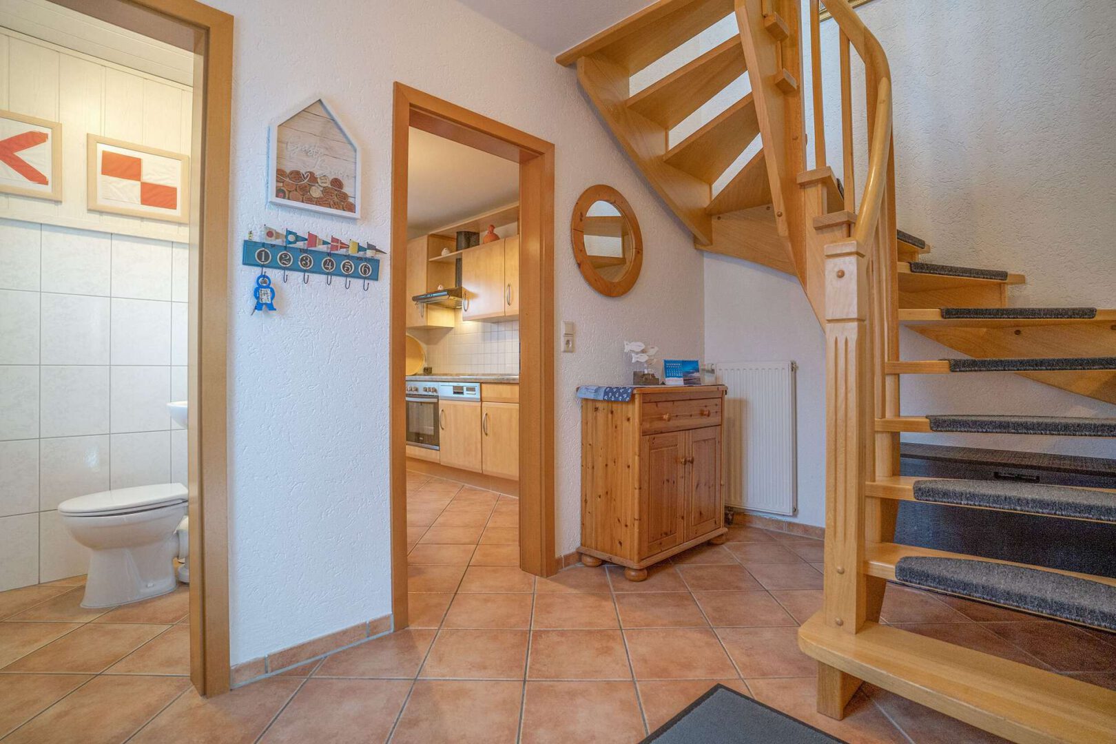 Die Immobilie erstreckt sich über zwei Etagen. Im Erdgeschoss empfängt Sie ein heller Wohnbereich mit direktem Zugang zur sichtgeschützten Terrasse – ein perfekter Platz für entspannte Stunden. Die offene Diele mit Massivholztreppe schafft eine harmonische Verbindung zwischen den Räumen. Die gepflegte Einbauküche von 2010, ergänzt durch einen praktischen Abstellraum, lädt zum Kochen und Genießen ein. Ein Gäste-WC im Eingangsbereich rundet das Raumangebot ab.