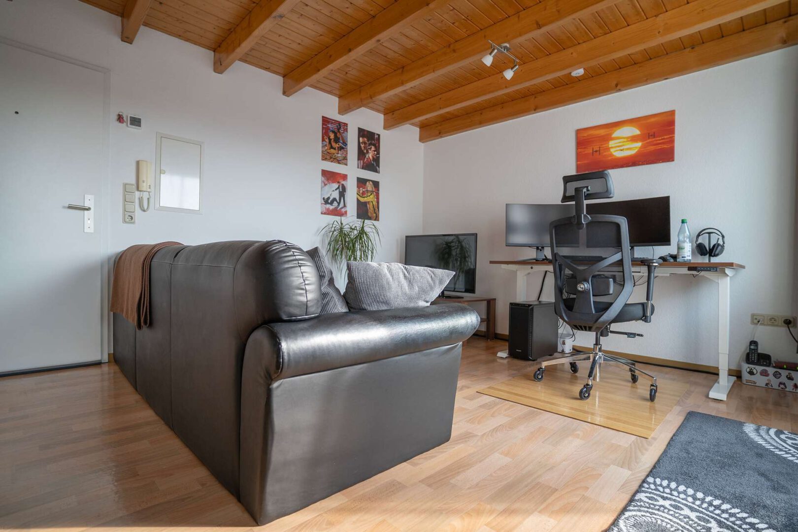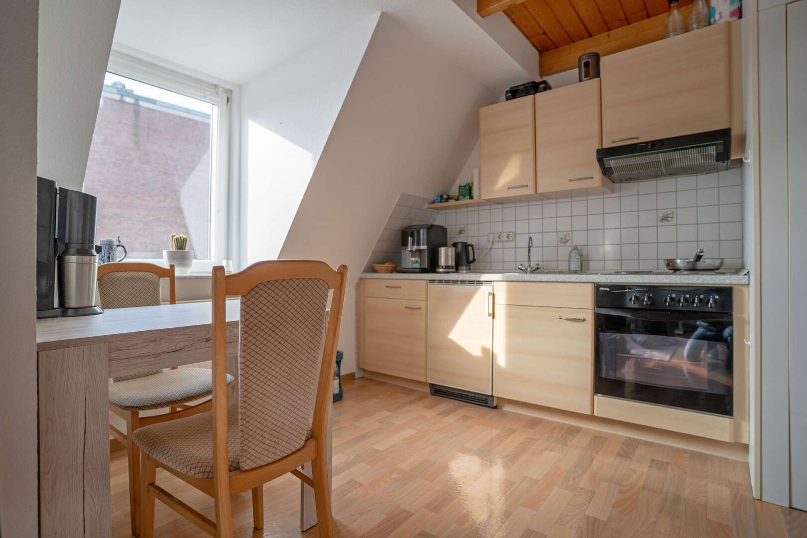 Die Wohnung erstreckt sich über zwei Ebenen und verfügt über einen offenen Wohn- und Kochbereich mit praktischer Einbauküche (im Mietpreis enthalten). Ein Schlafzimmer und das Tageslichtbad befinden sich im Dachgeschoss. Dieses ist mit einer komfortablen Dusche, einem WC sowie einem Waschmaschinenanschluss ausgestattet und rundet das durchdachte Raumangebot ab.