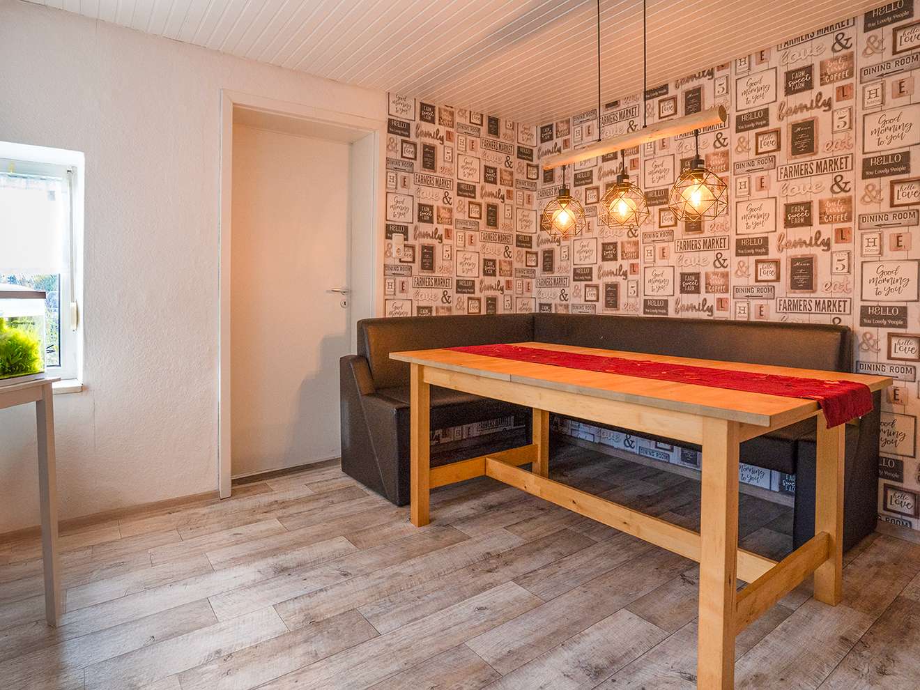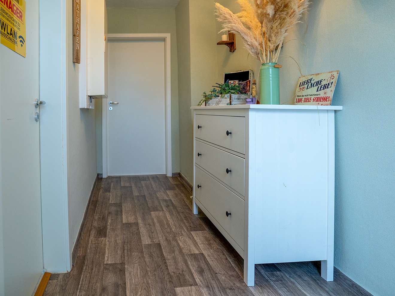 Angrenzend an den Flur befindet sich ein geräumiger Hauswirtschaftsraum, der neben Platz für Vorräte auch praktische Abstellmöglichkeiten für Speisen oder Geräte bietet. Über einen weiteren Flurabschnitt gelangen Sie in das Esszimmer, von dem aus ein innenliegendes, modern saniertes Duschbad sowie ein separates Gäste-WC erreichbar sind.