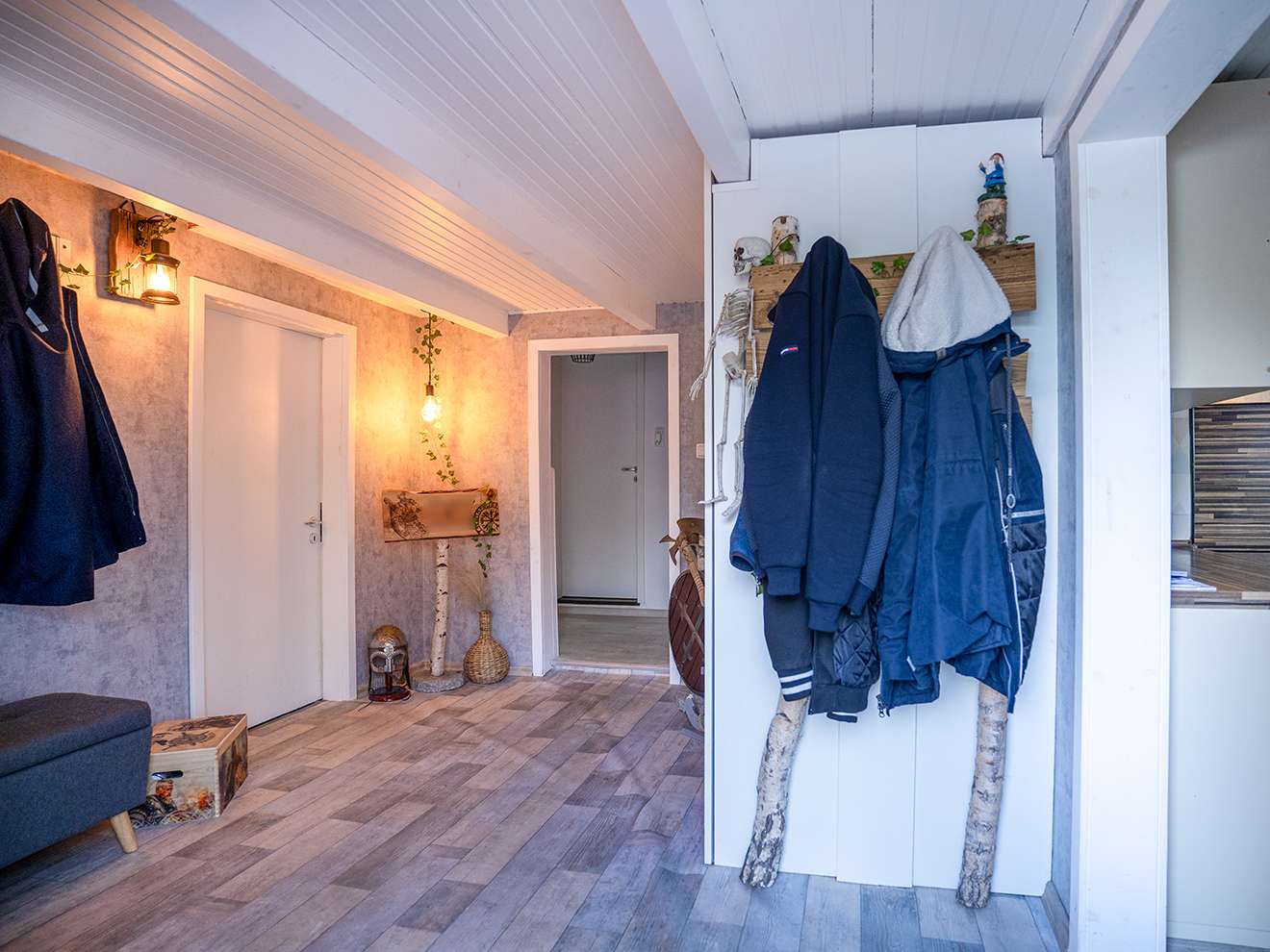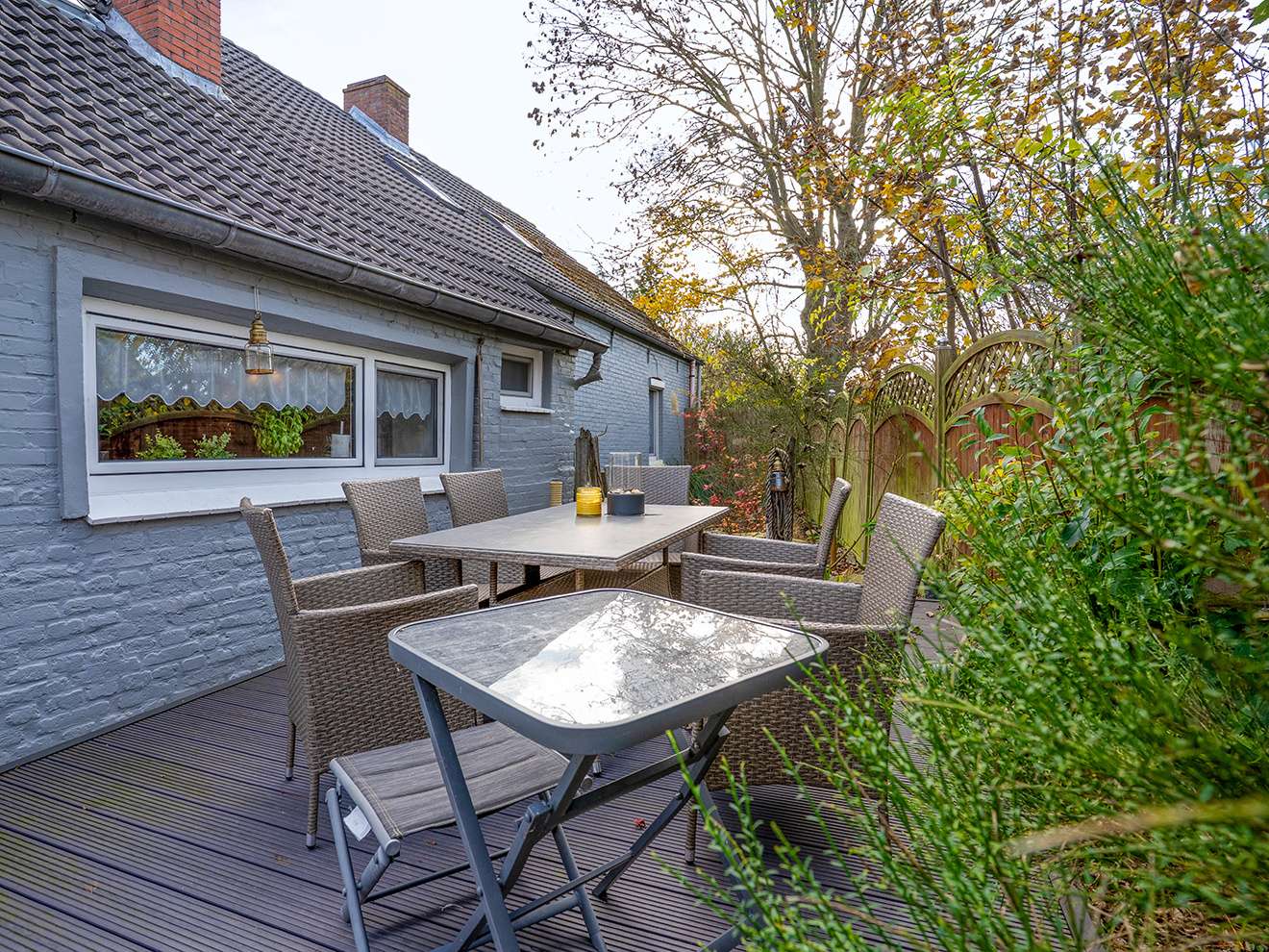 Der Außenbereich überzeugt mit einem überschaubaren, gepflegten Garten, zwei praktischen Gartenhütten und einer liebevoll angelegten Terrasse, auf der Sie windgeschützt und ruhig die Sonne genießen können.
