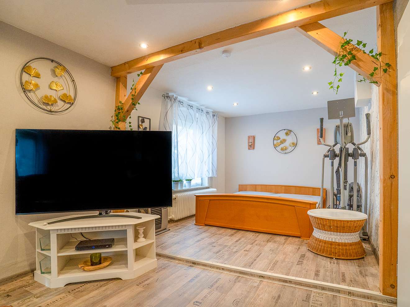 Vom Esszimmer gelangt man in einen kleinen Zwischenflur, von dem aus das großzügige Wohnzimmer erreichbar ist. Der Raum wird aktuell als kombinierter Wohn- und Schlafbereich genutzt und besticht durch seine Offenheit sowie das helle, freundliche Ambiente. Zusätzlich steht ein weiteres Zimmer zur Verfügung, das sich ideal als Kinderzimmer, Büro oder vielseitig nutzbarer Hobbyraum eignet – perfekt für Familien oder Homeoffice-Lösungen.